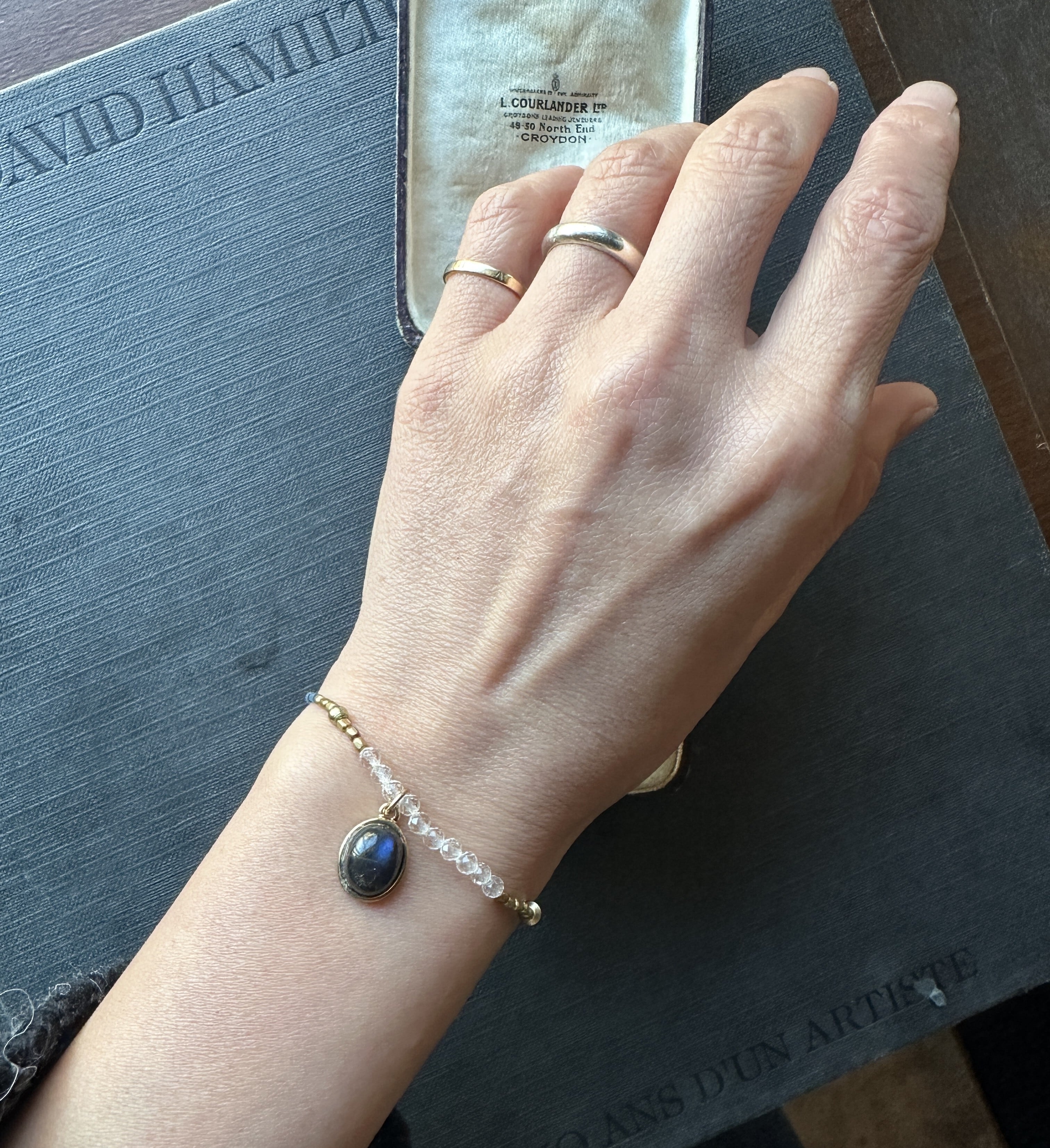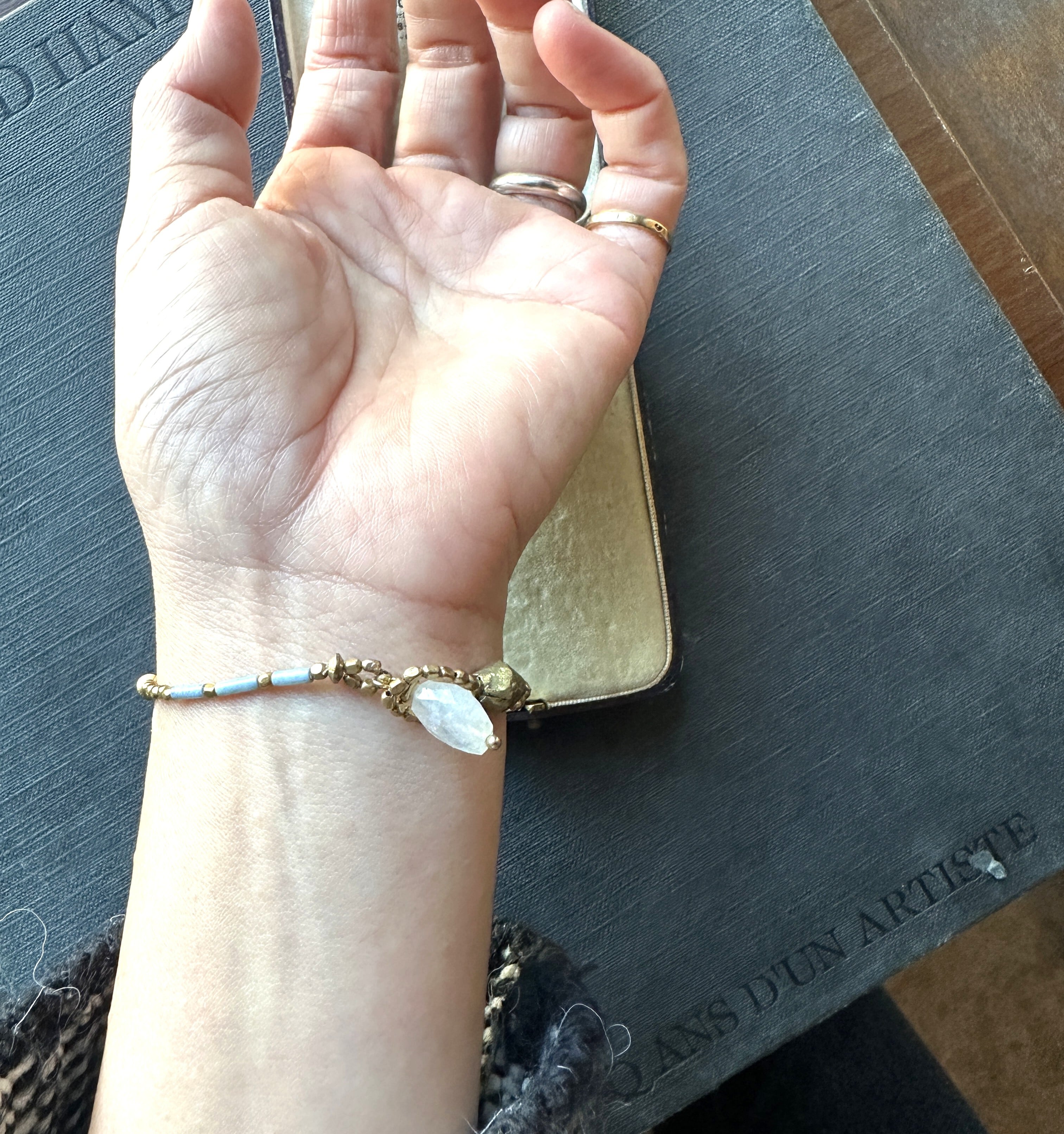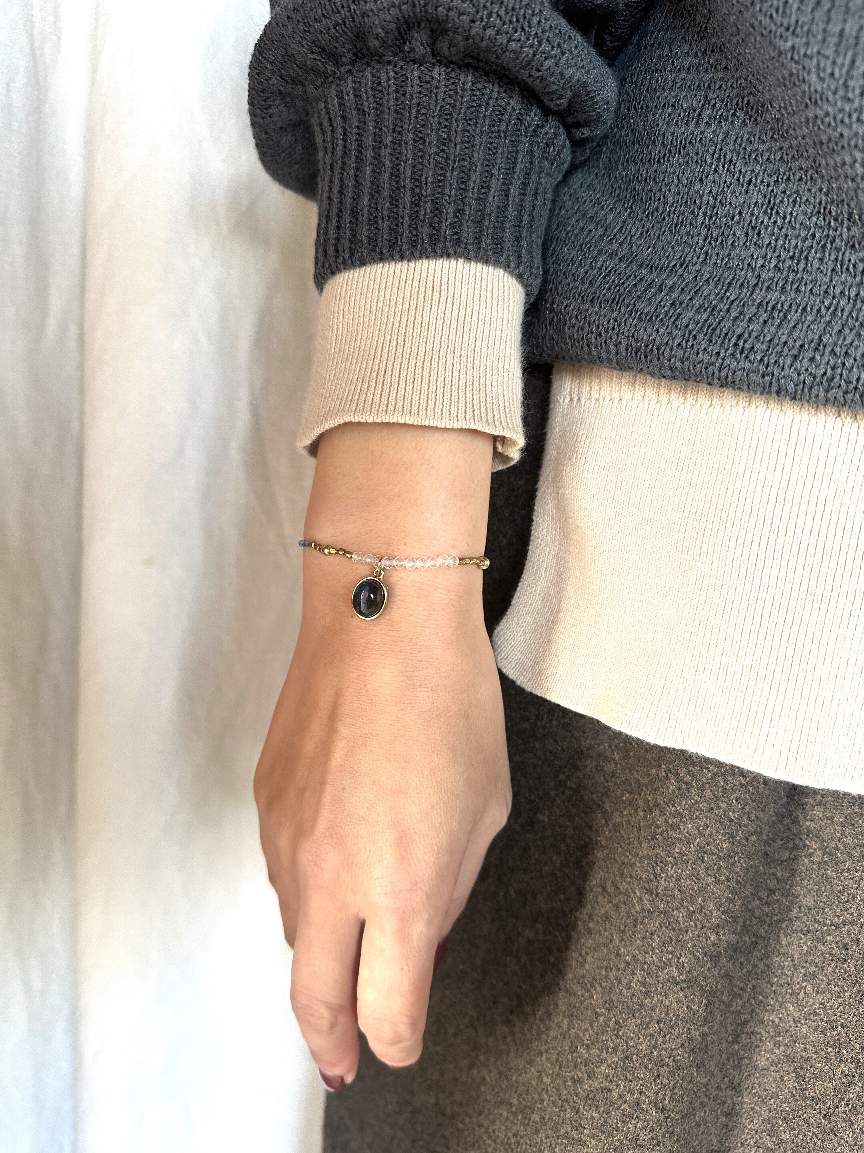 自然の美しさを纏った、ブルーラブラドライド 藍染ビーズと真鍮ビーズのブレスレット