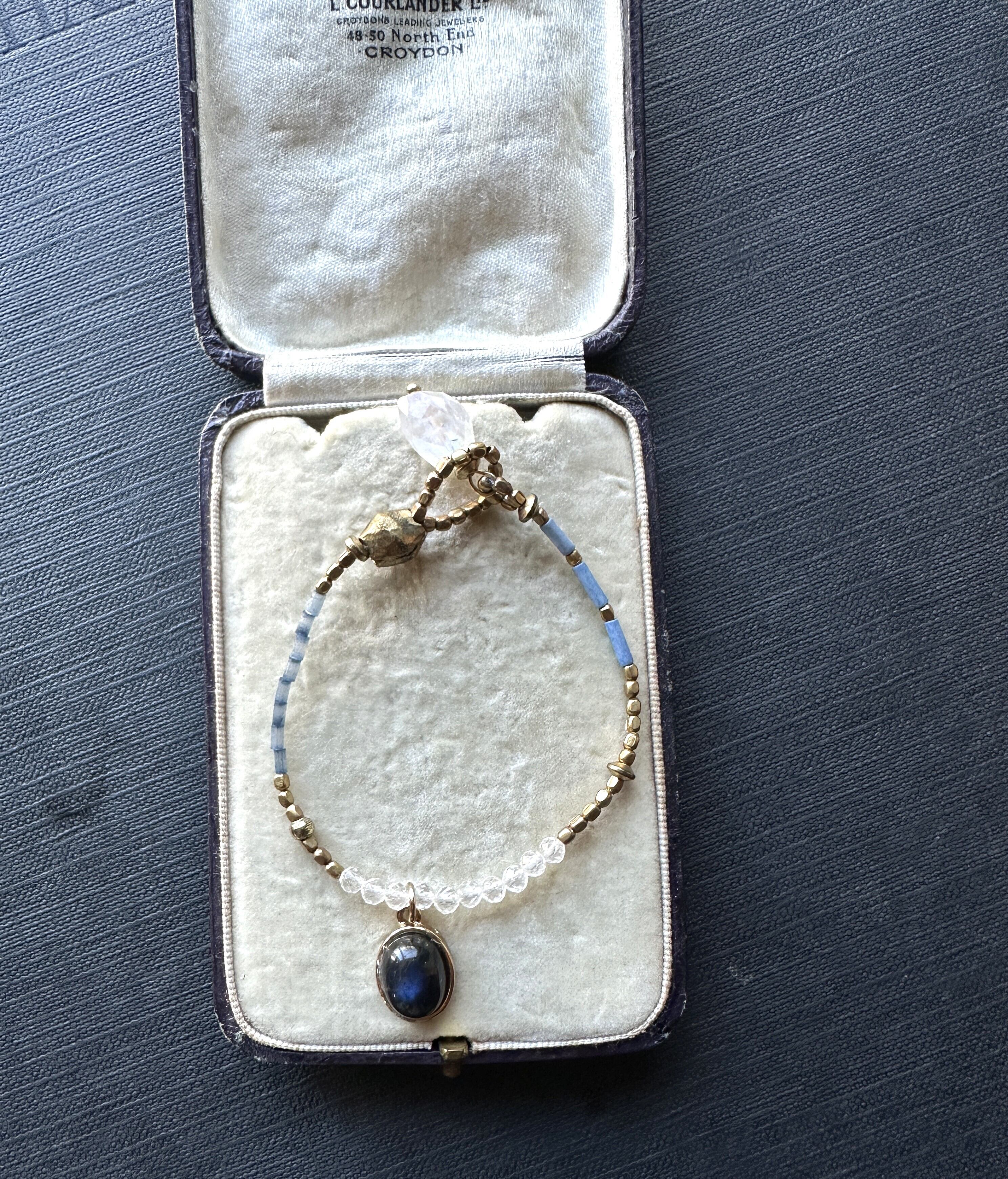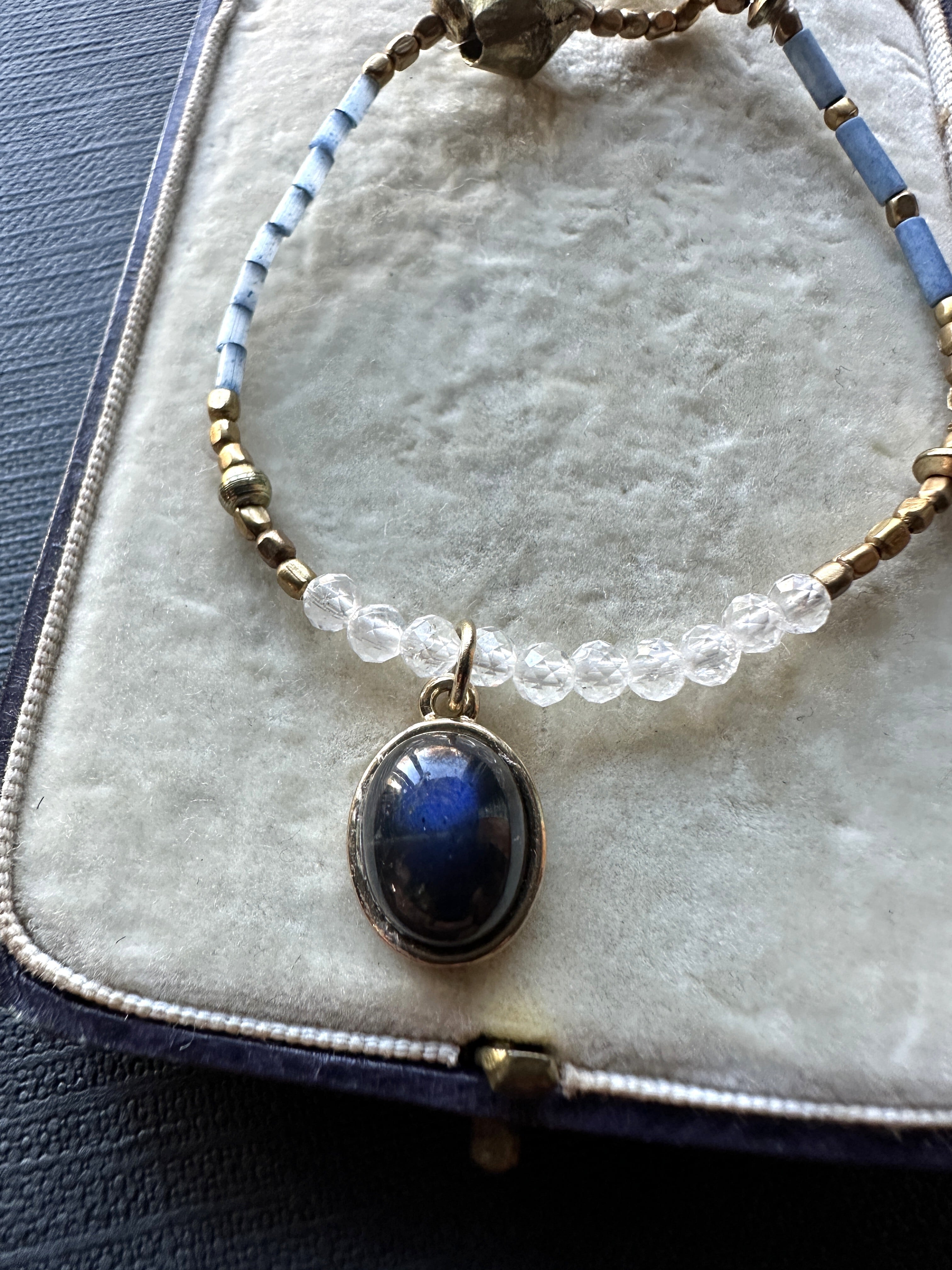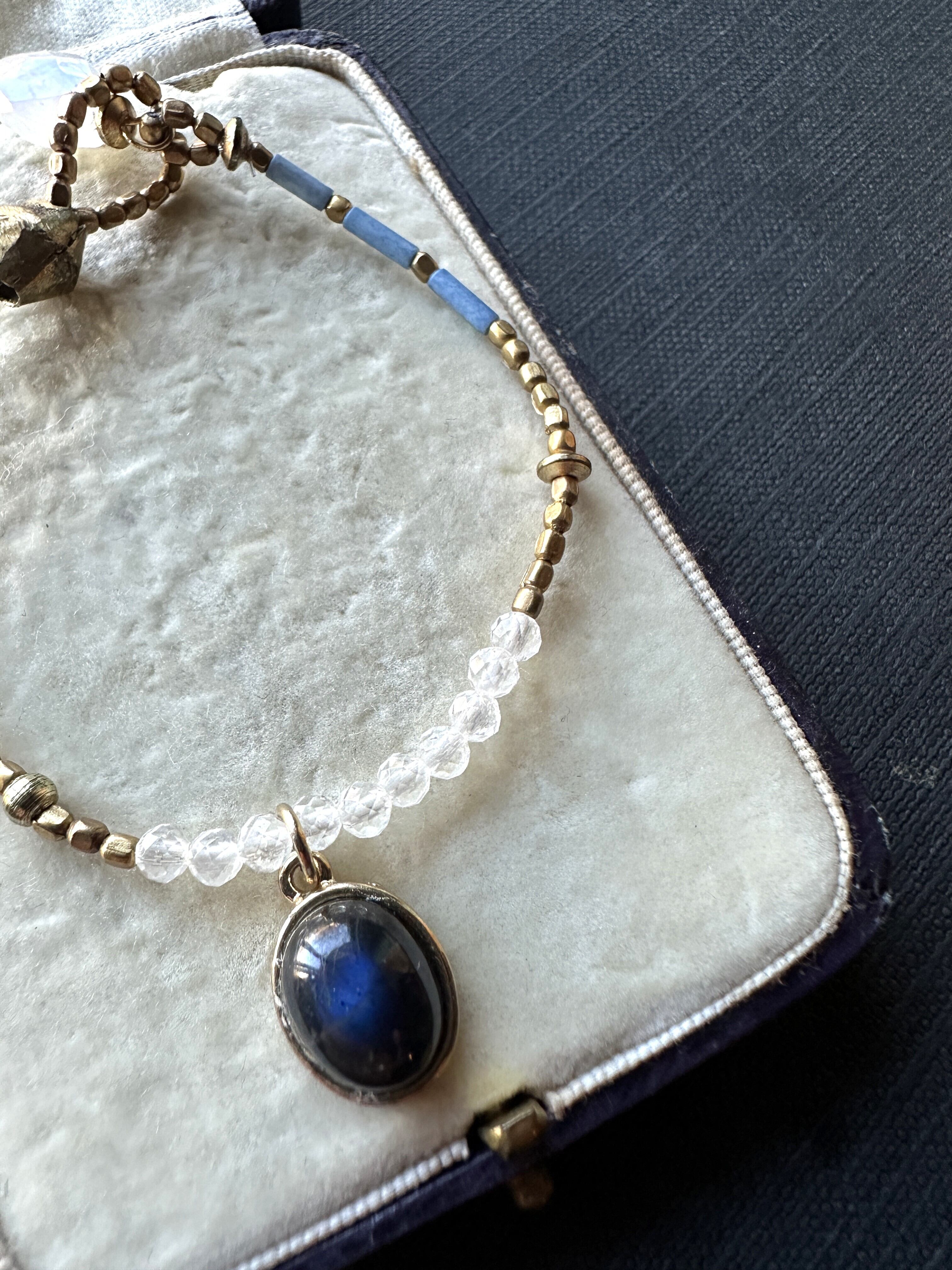素材:ブルーラブラドライド、藍染ビーズ、アフリカ真鍮ビーズ、レインボームーンストーン