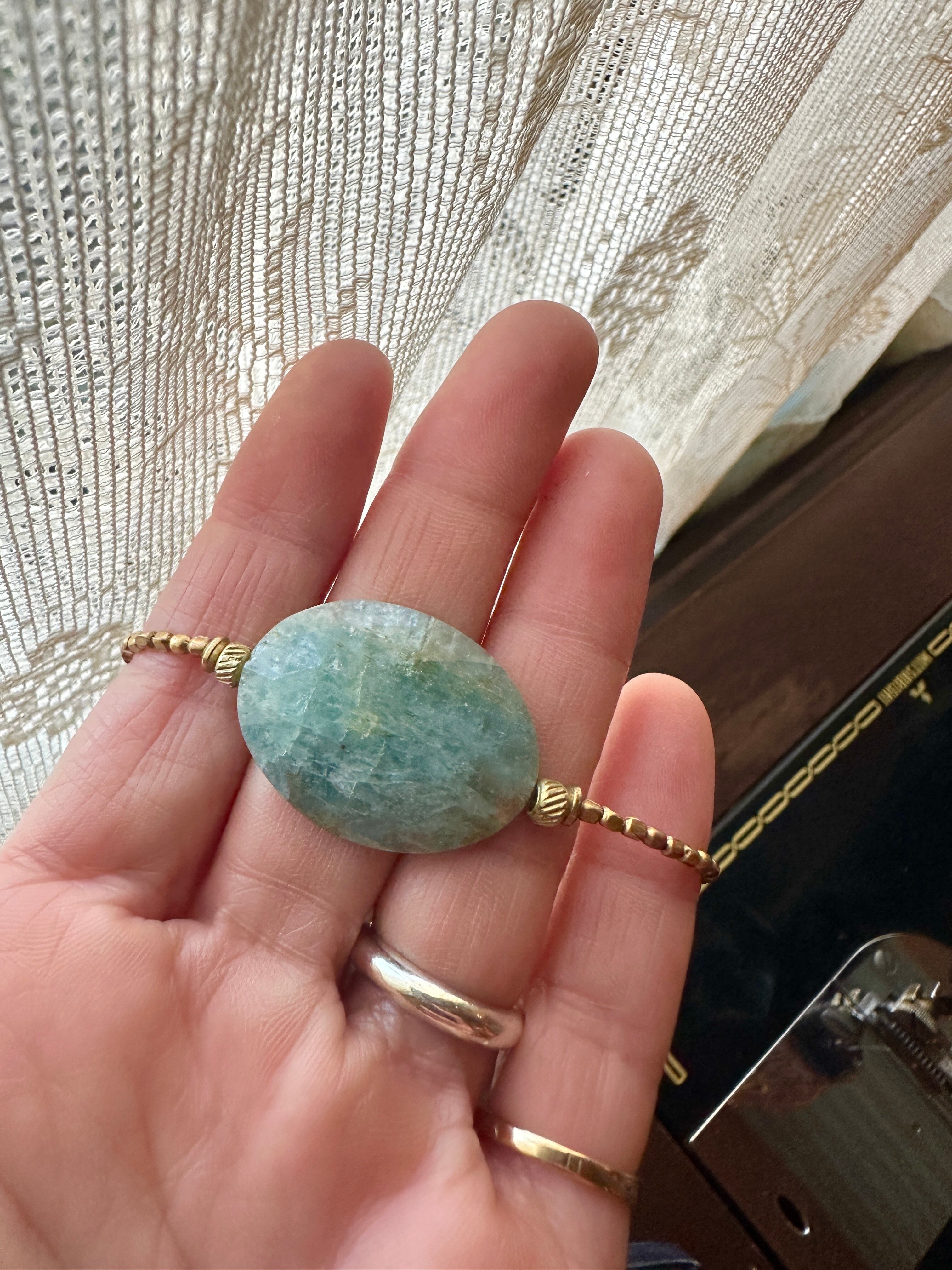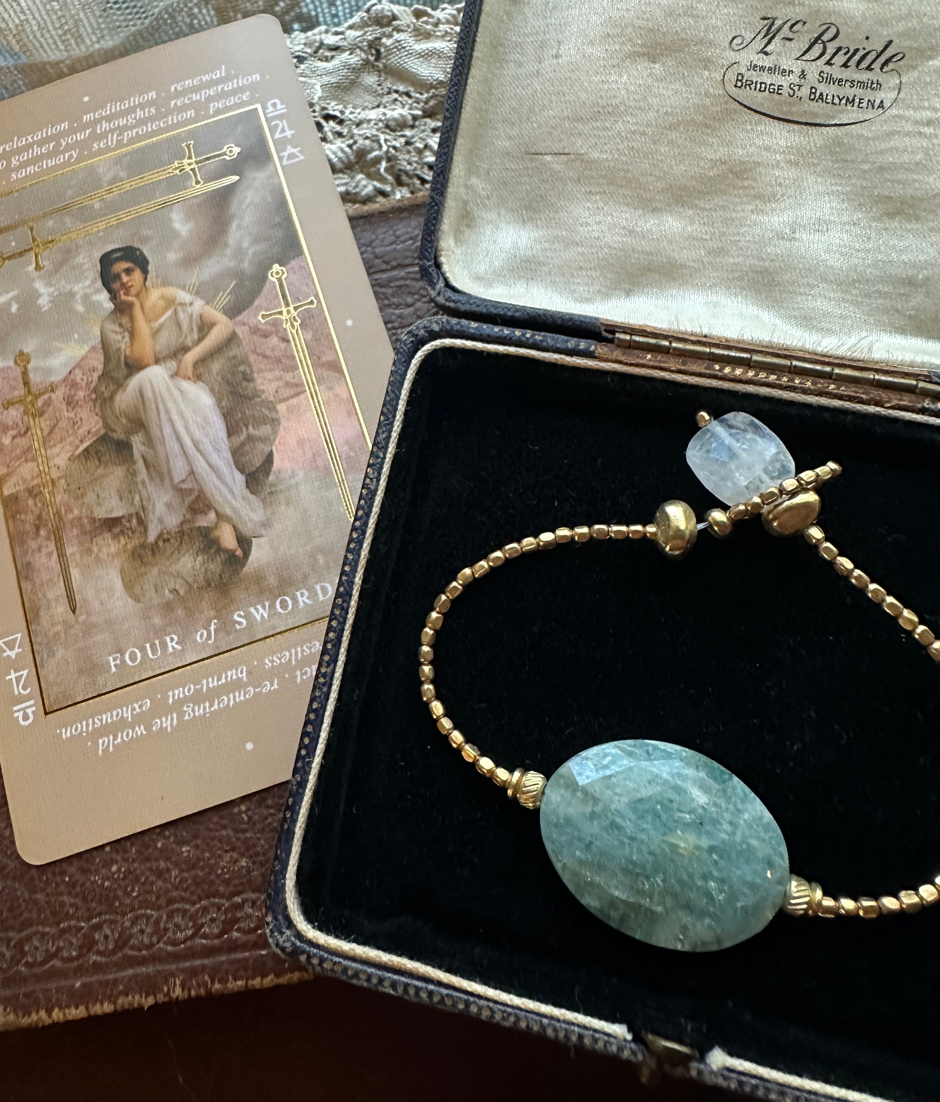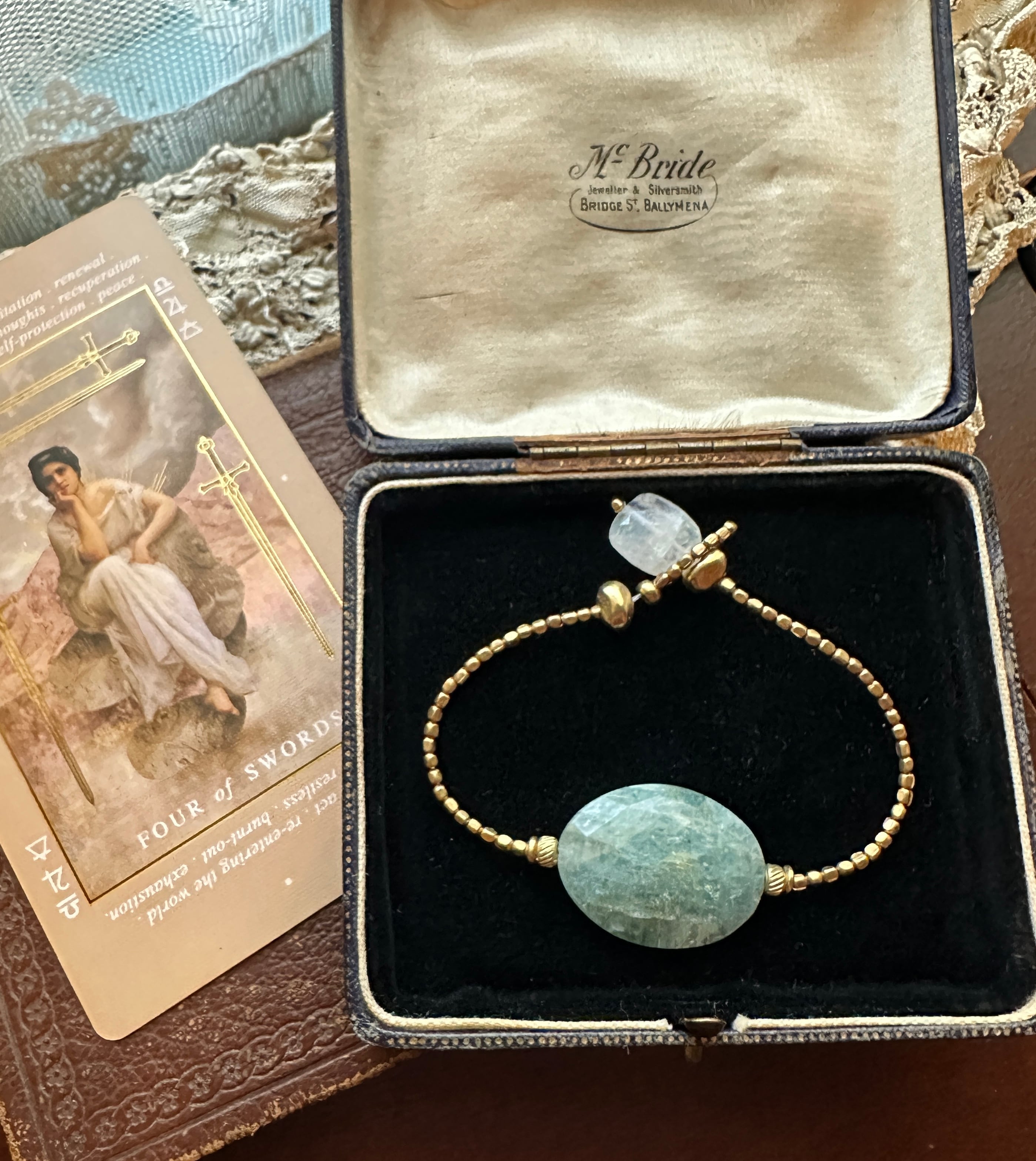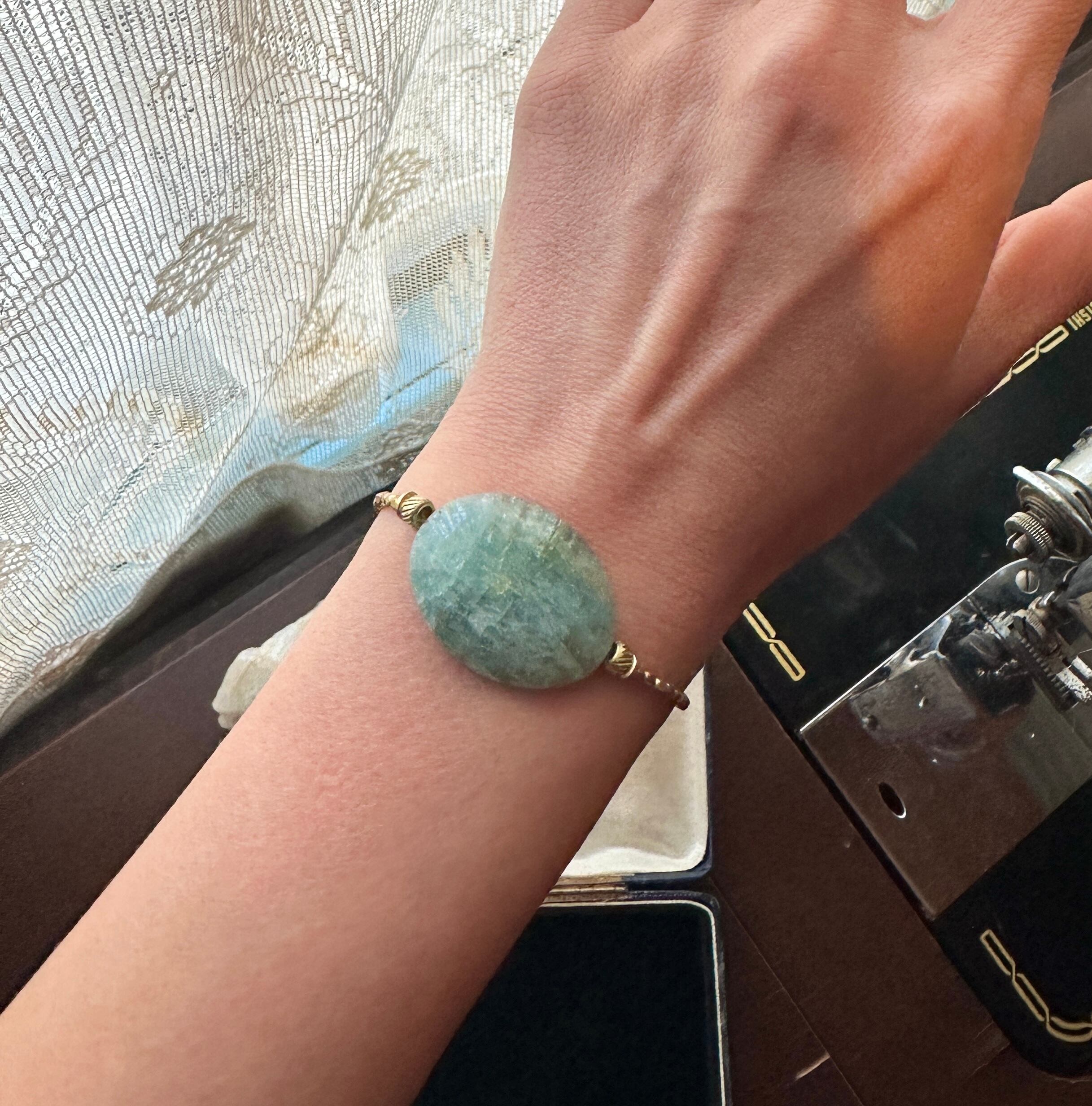カットの入ったアクアマリンが、光を受けてきらりと輝くブレスレット。