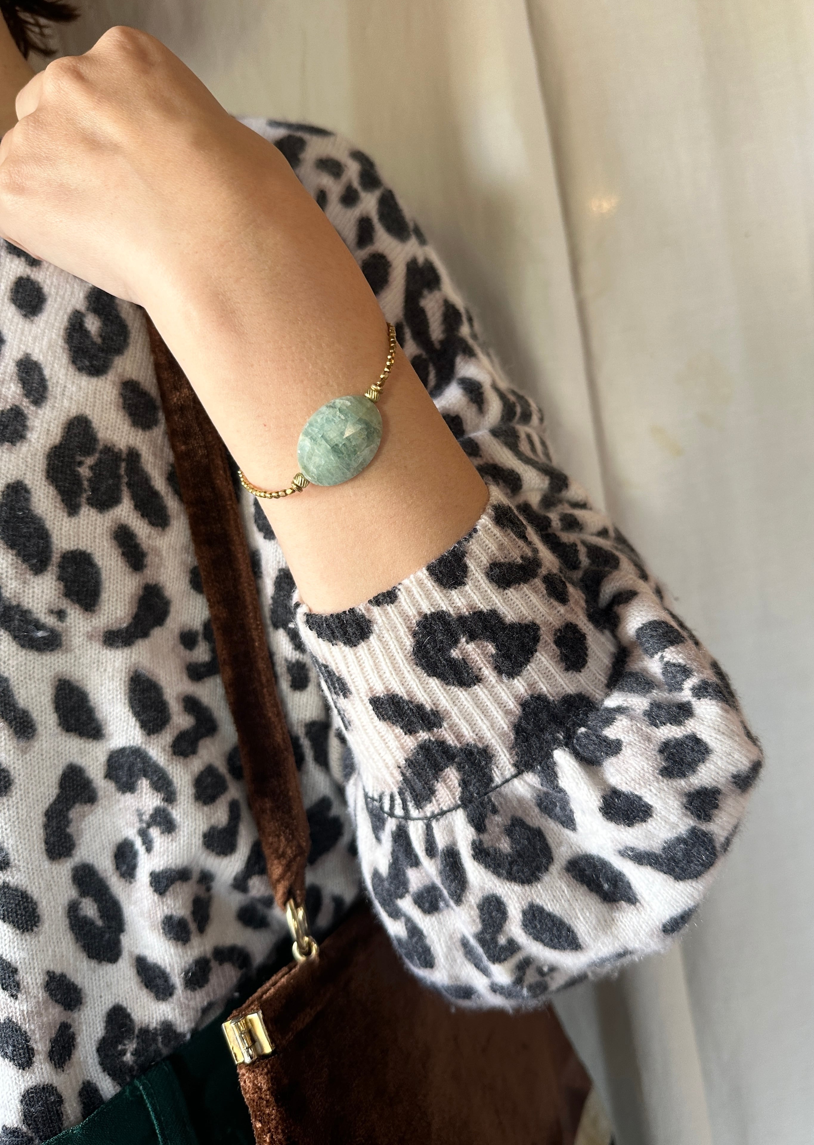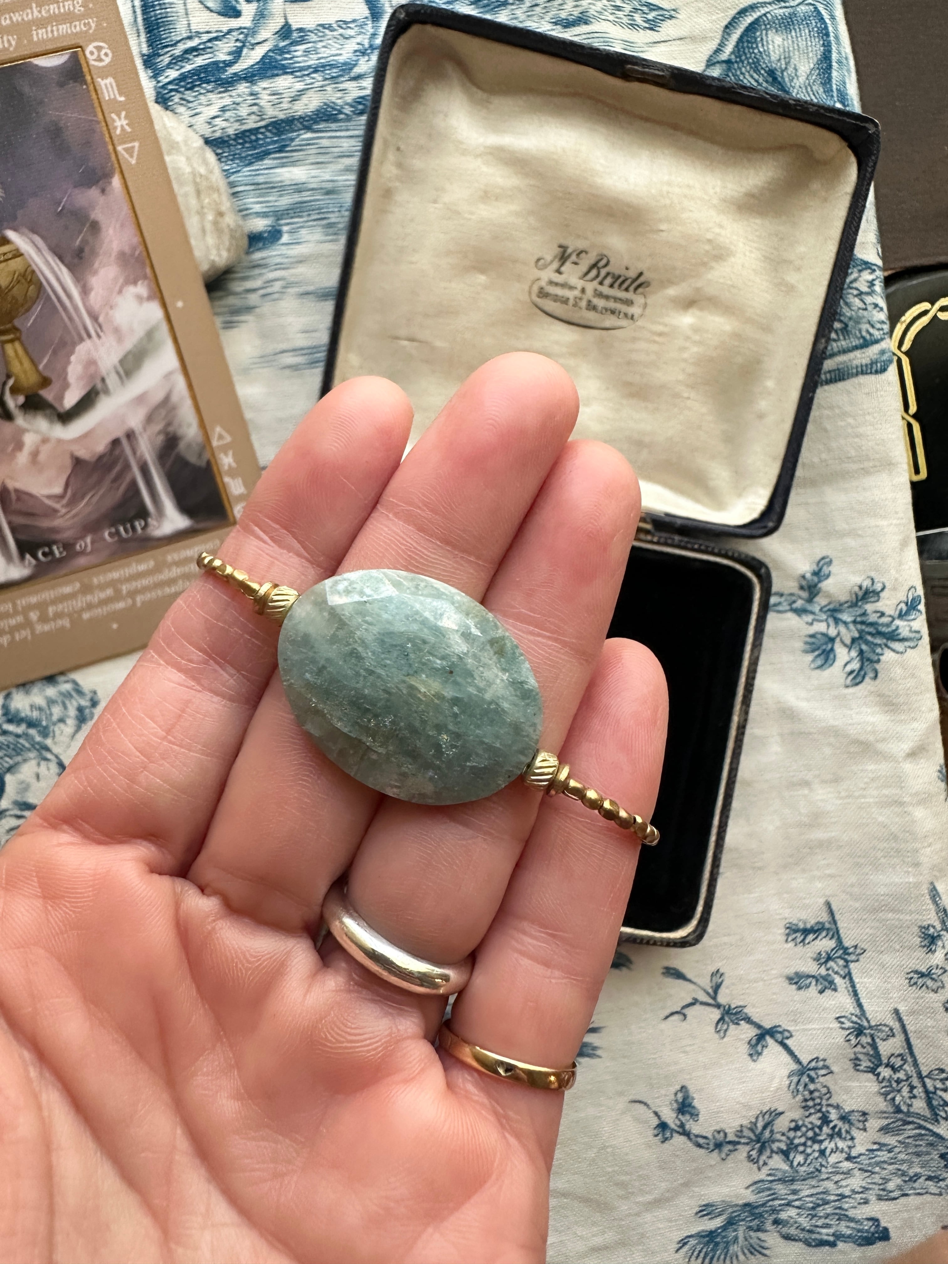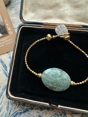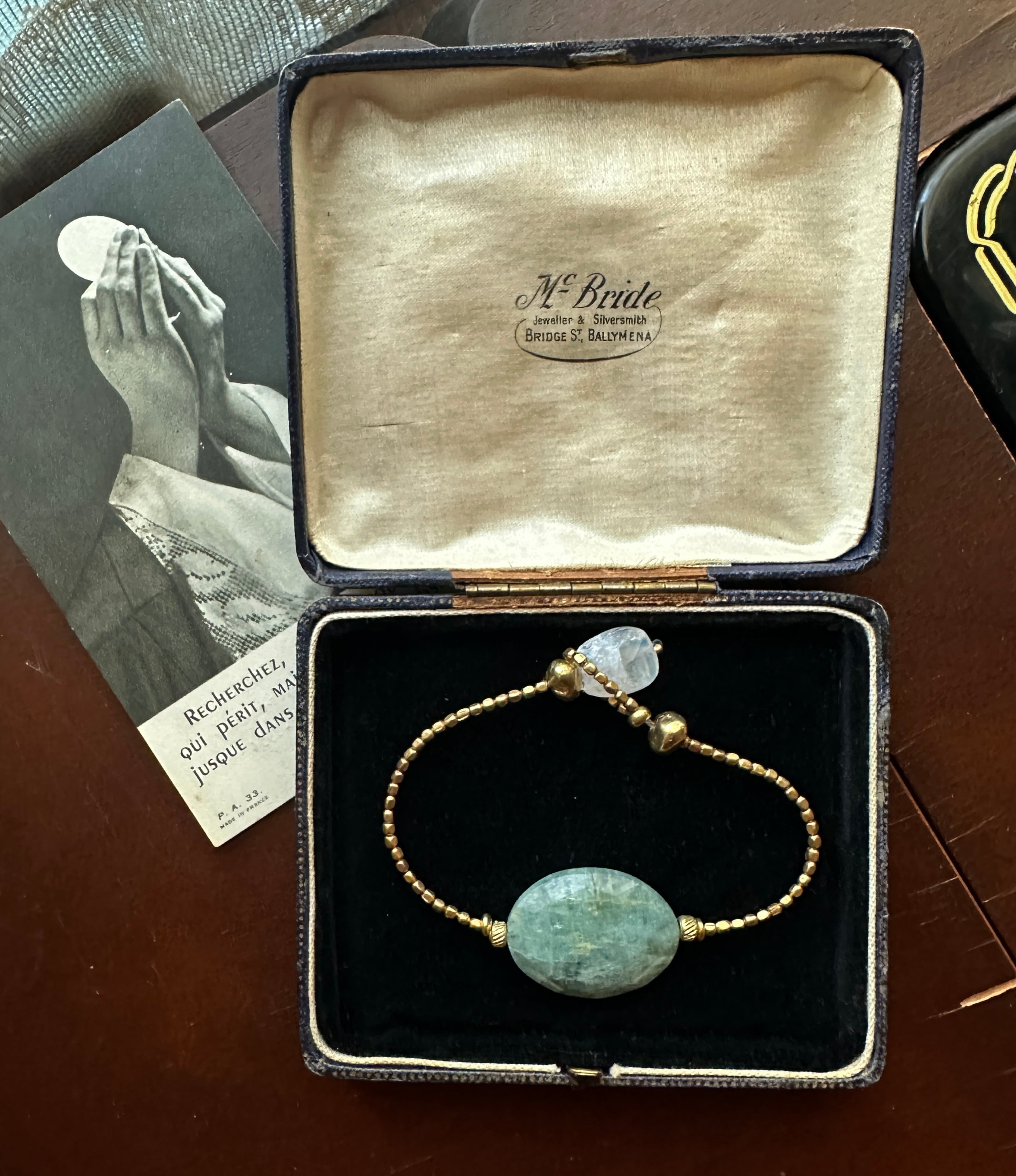 カットの入ったアクアマリンが、光を受けてきらりと輝くブレスレット。