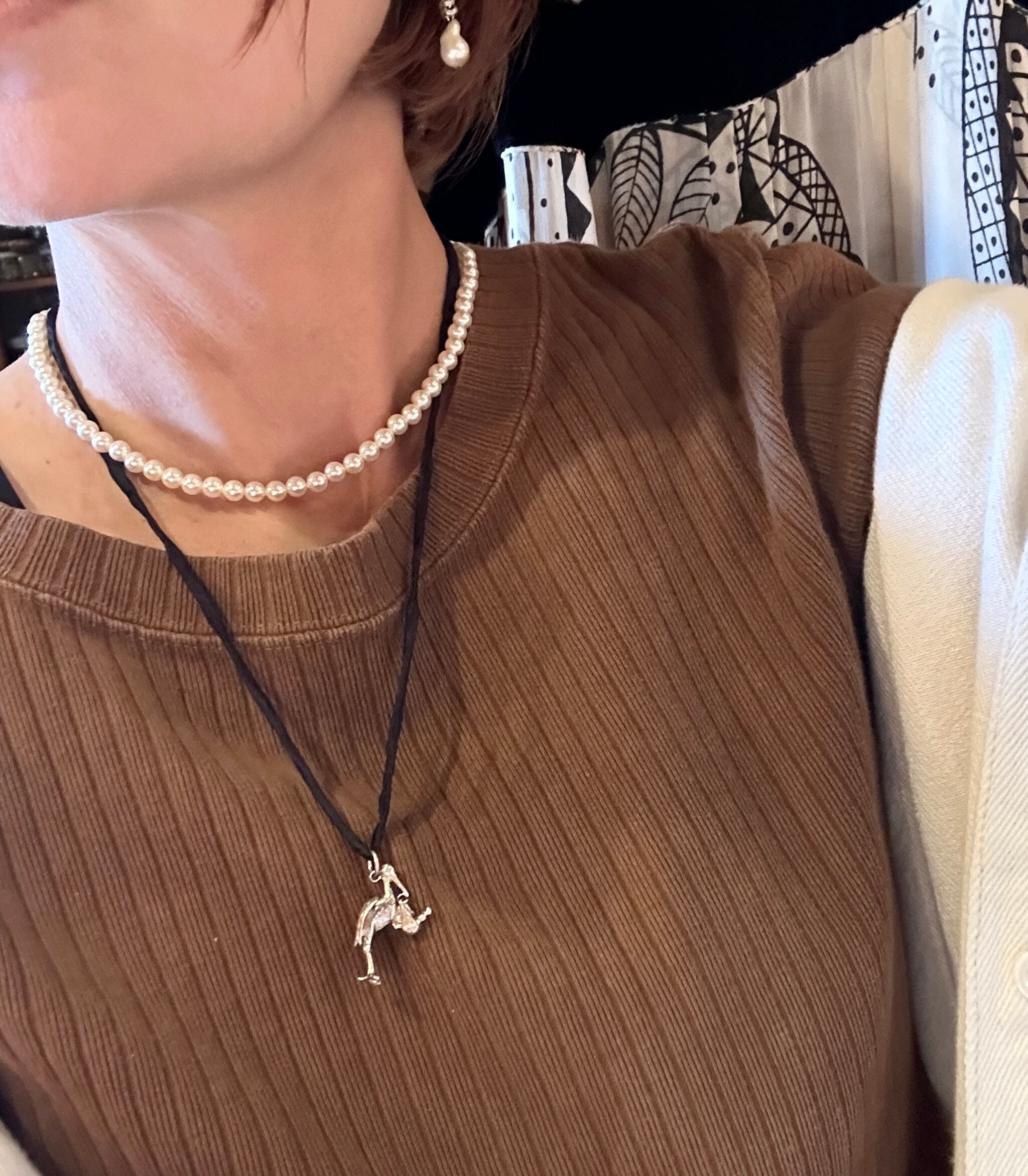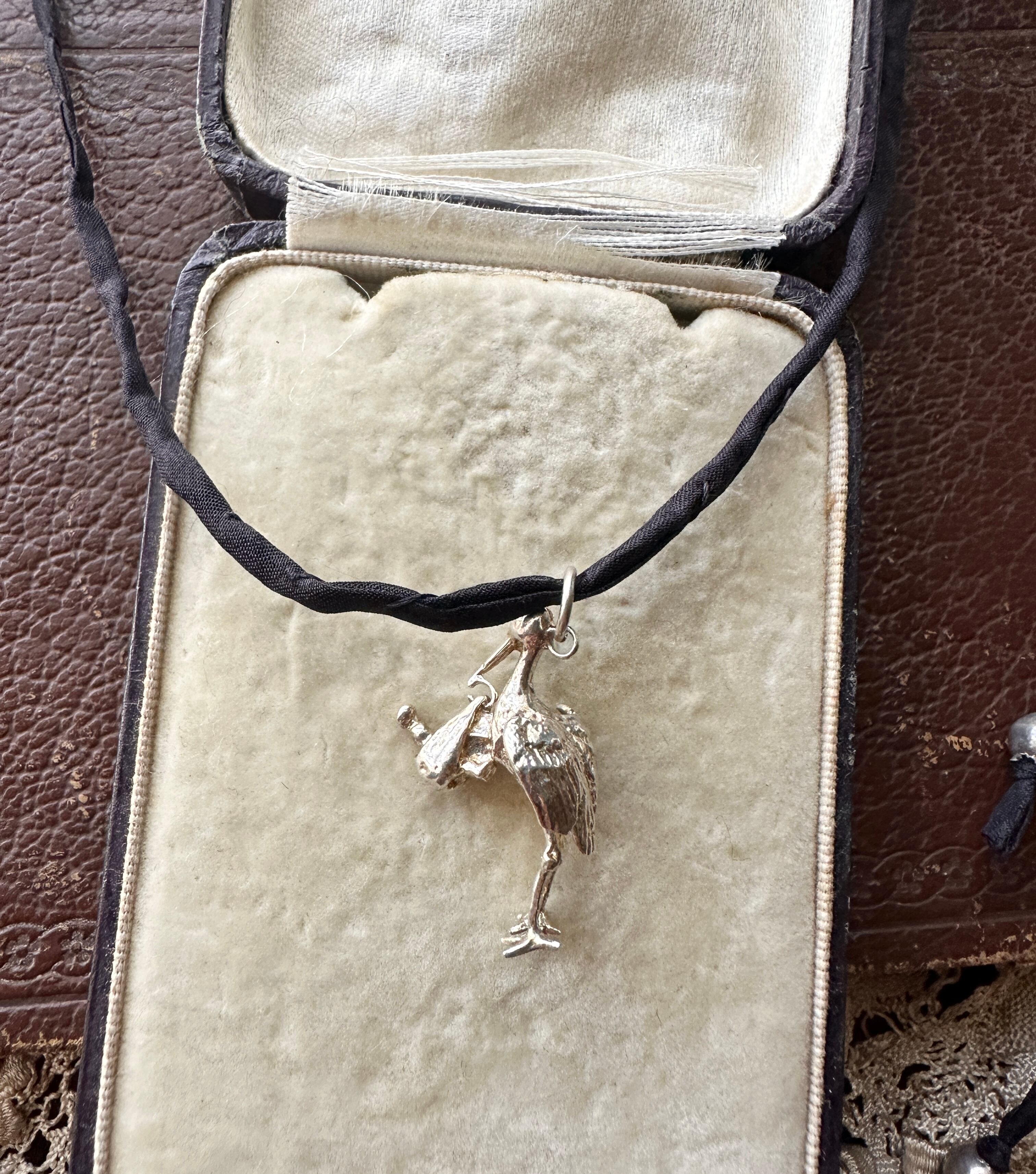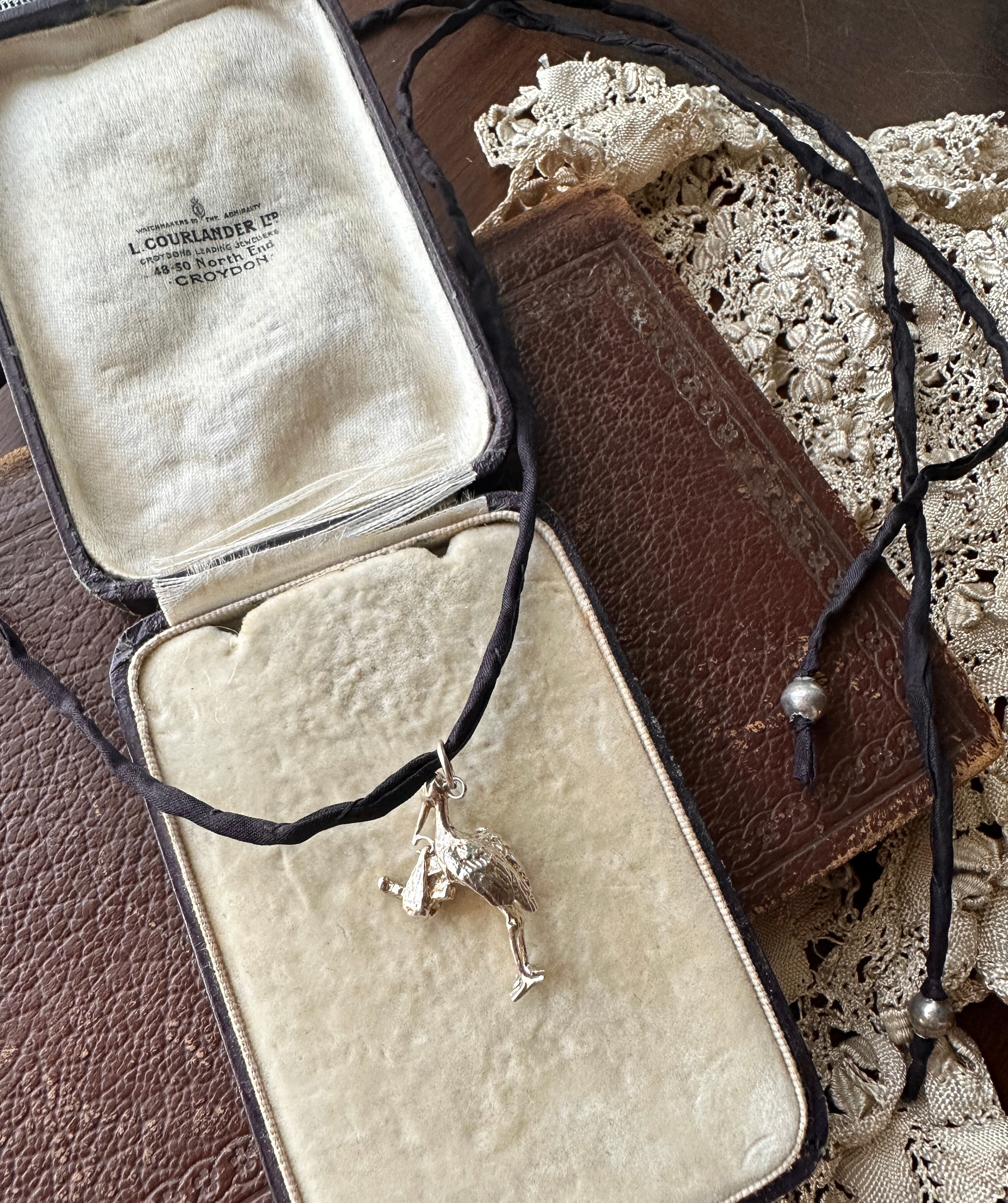 アメリカヴィンテージシルバー コウノトリチャーム ハンドメイドシルク紐ネックレス ― 1点もの ―