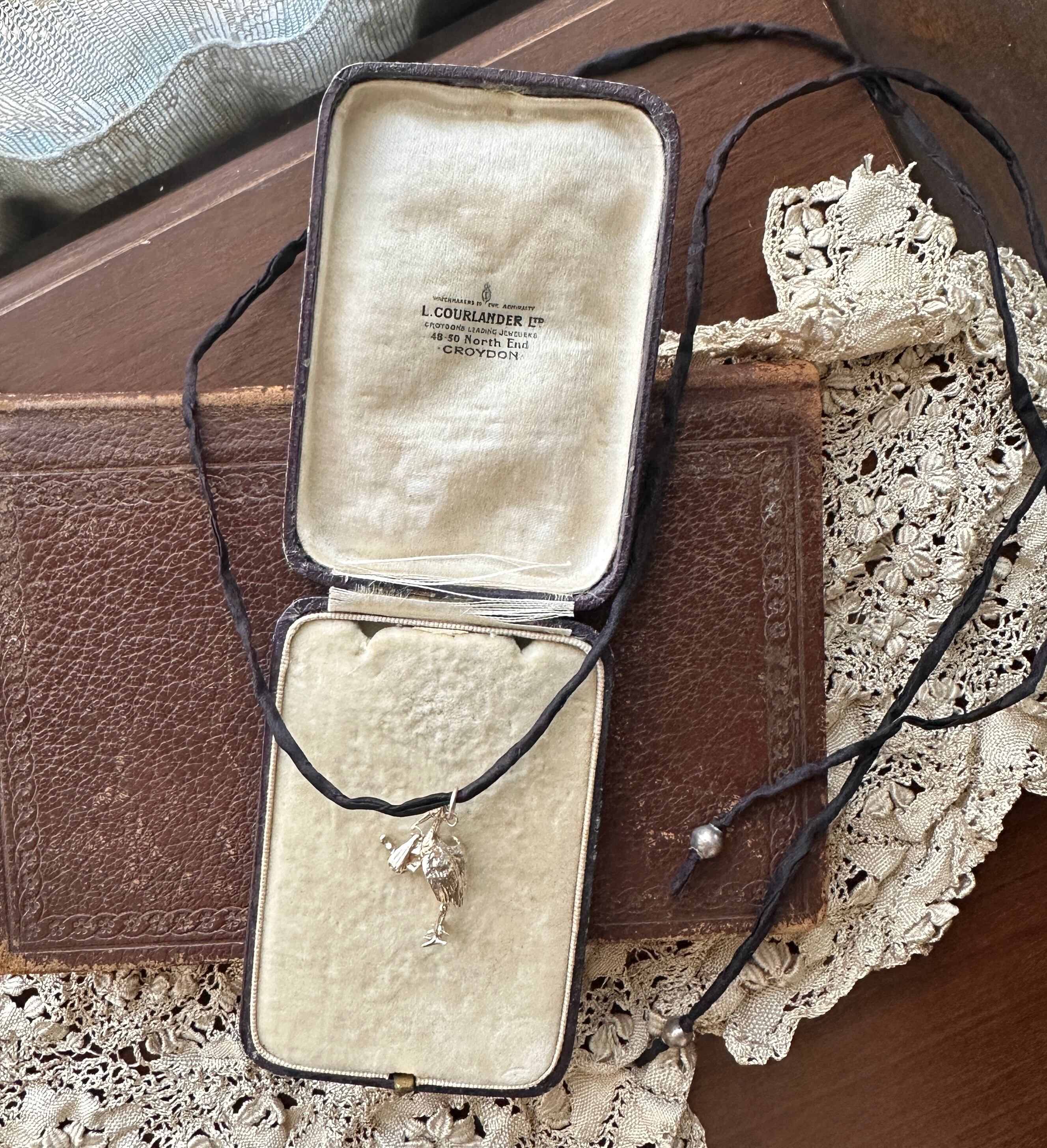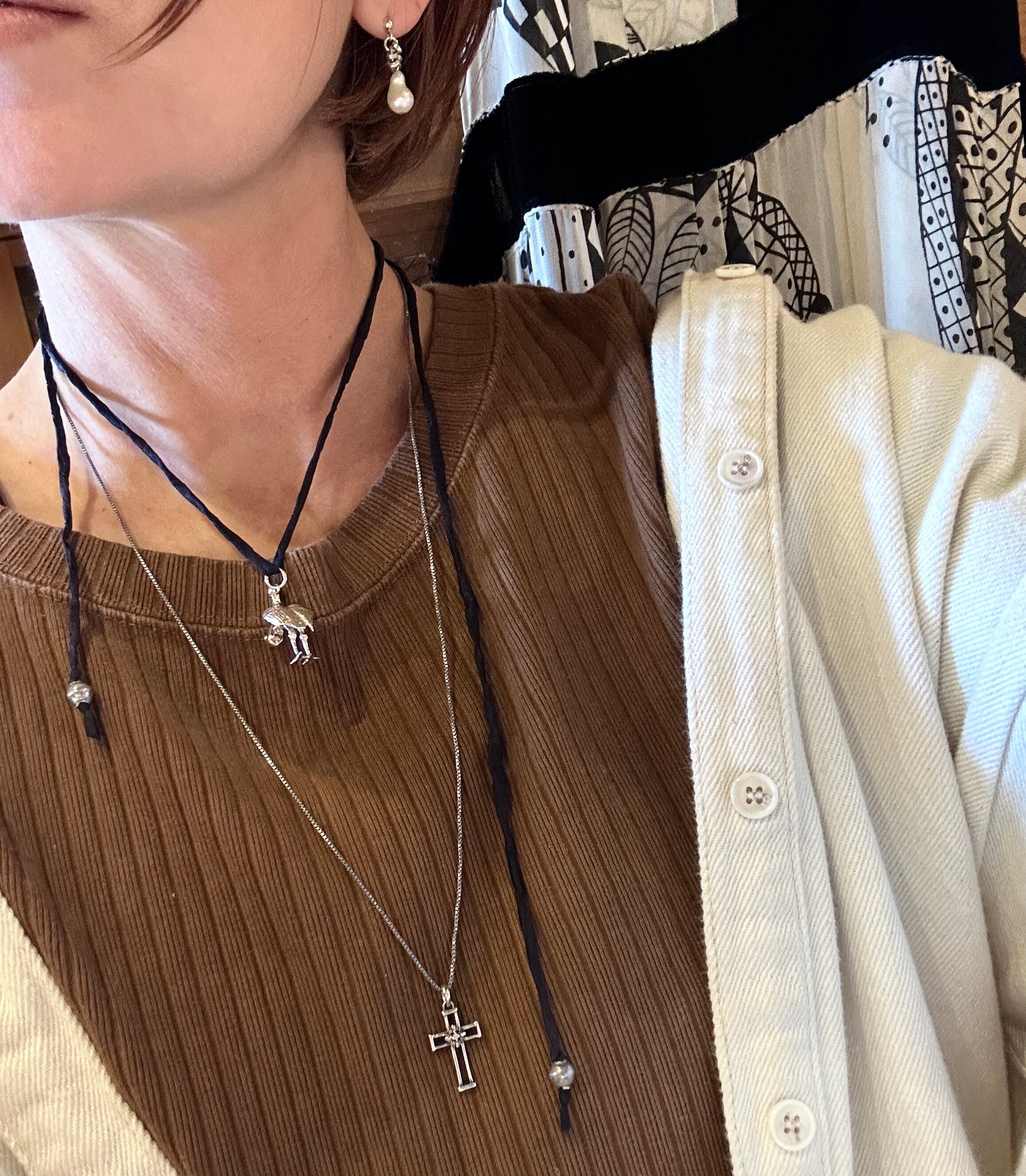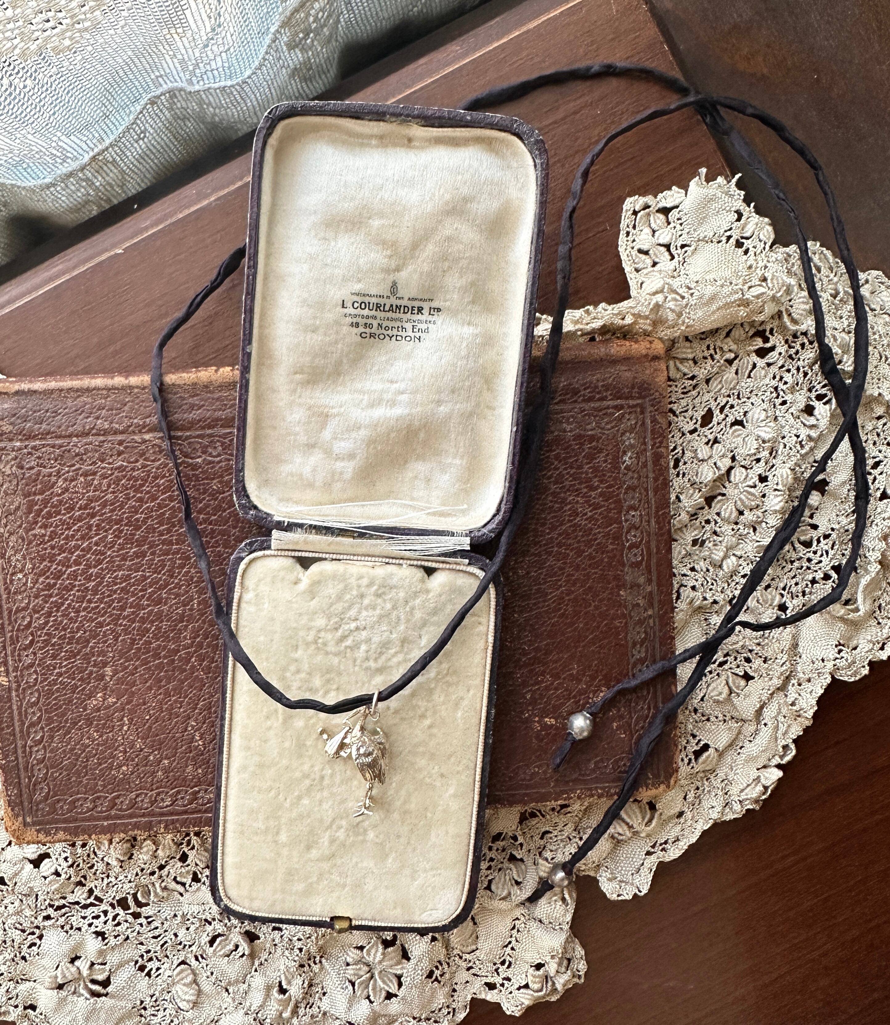 アメリカヴィンテージシルバー コウノトリチャーム ハンドメイドシルク紐ネックレス ― 1点もの ―