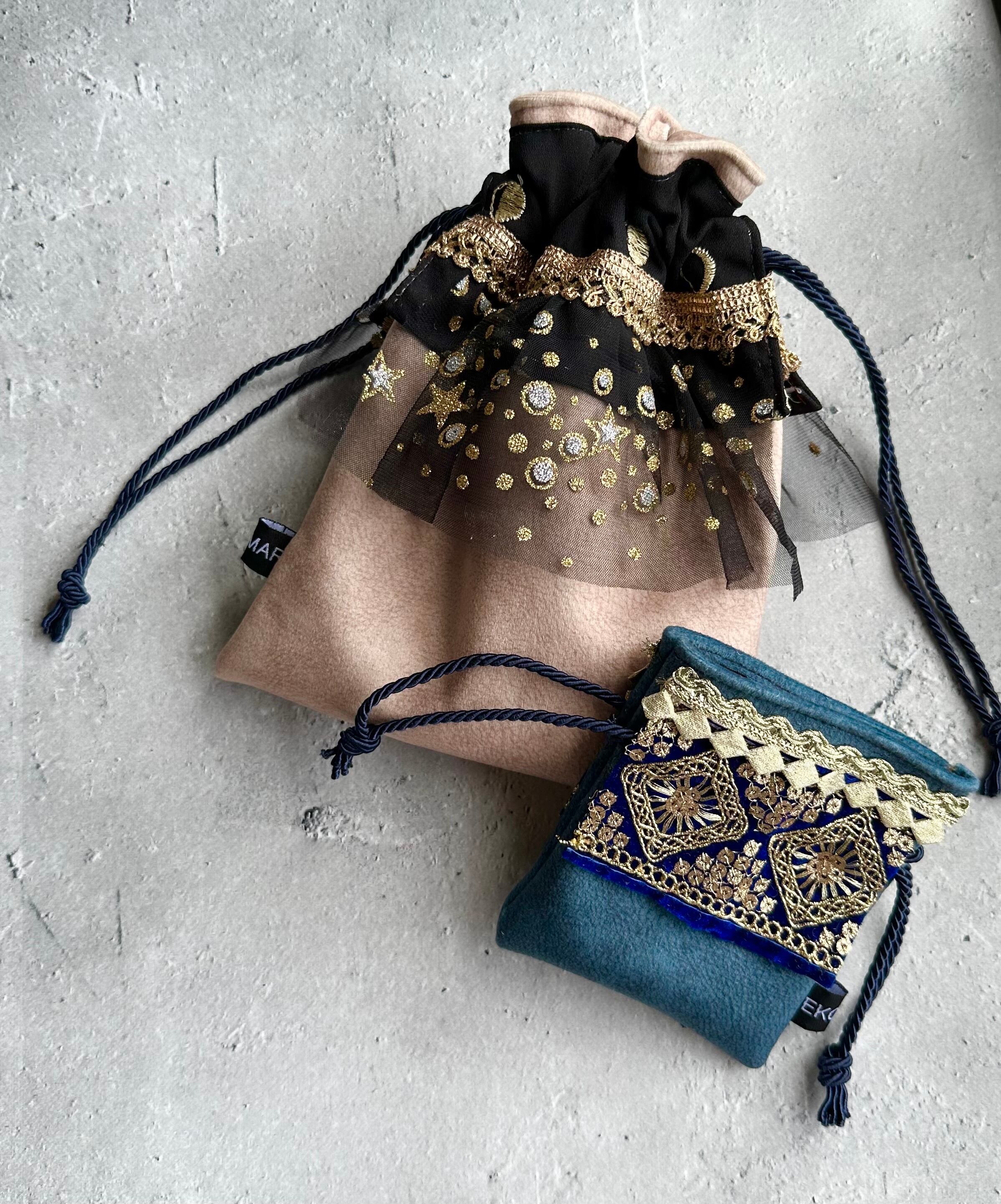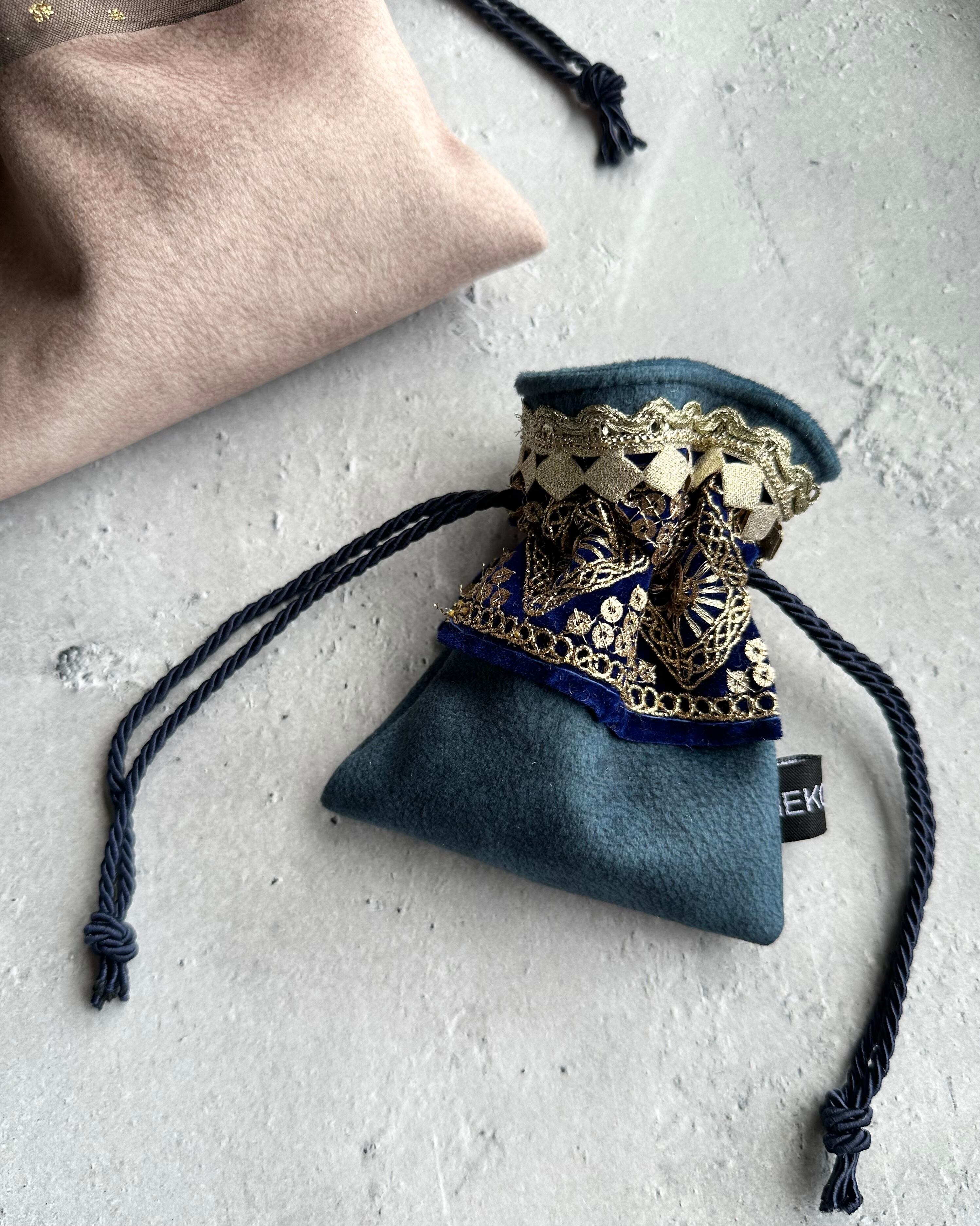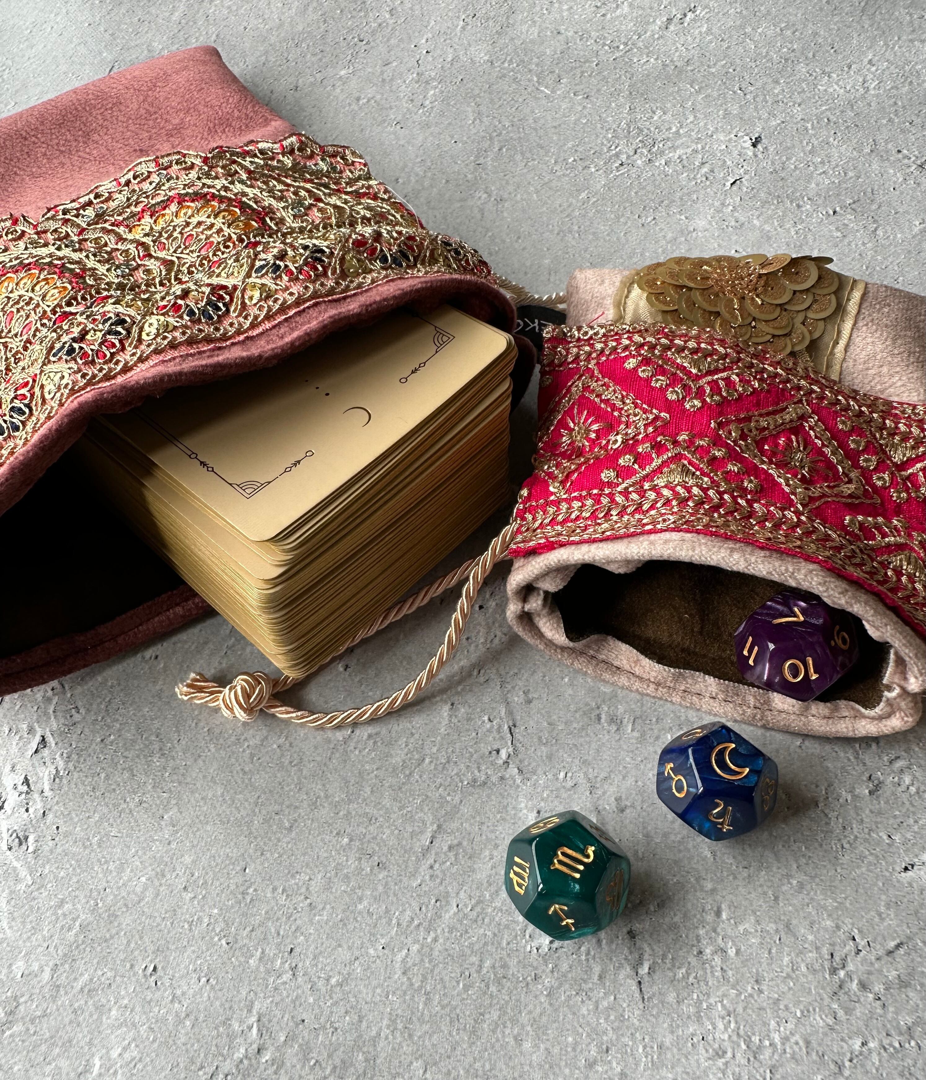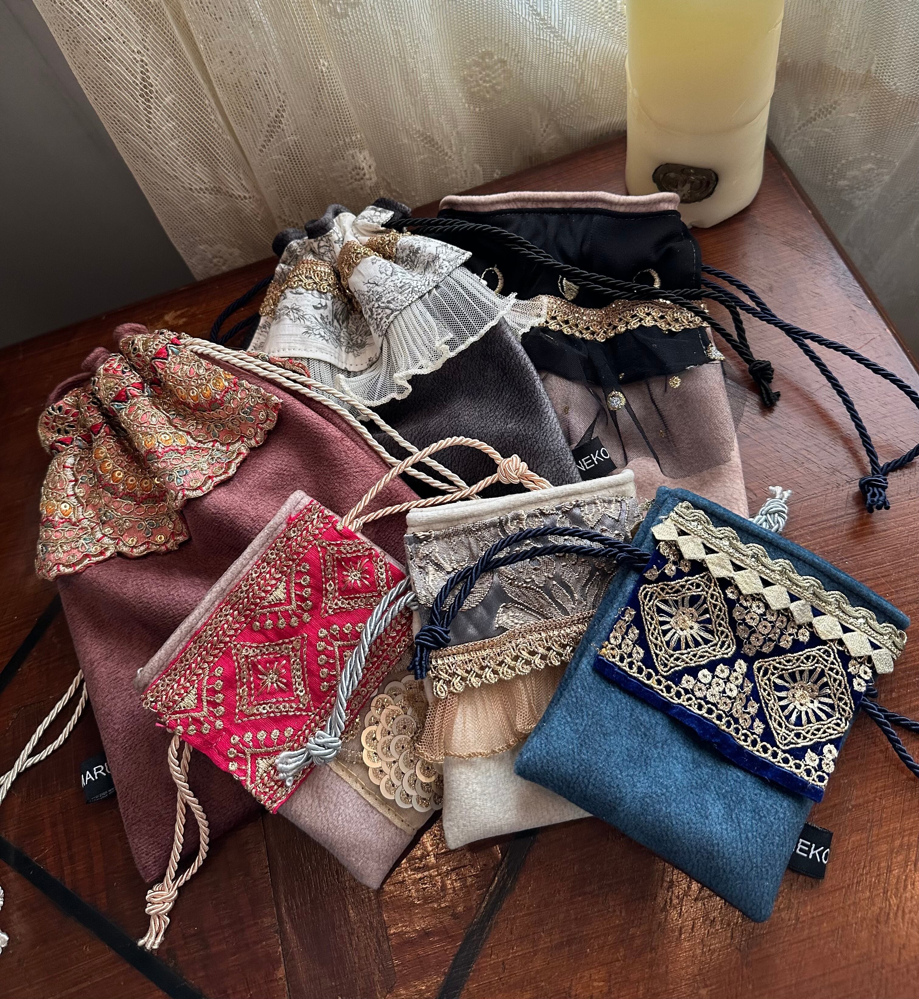 タロットクロス製作で余ったベロア生地と、刺繍リボンなど色々な素材を組み合わせ、遊び心溢れるデコラティブなポーチセットを作りました。