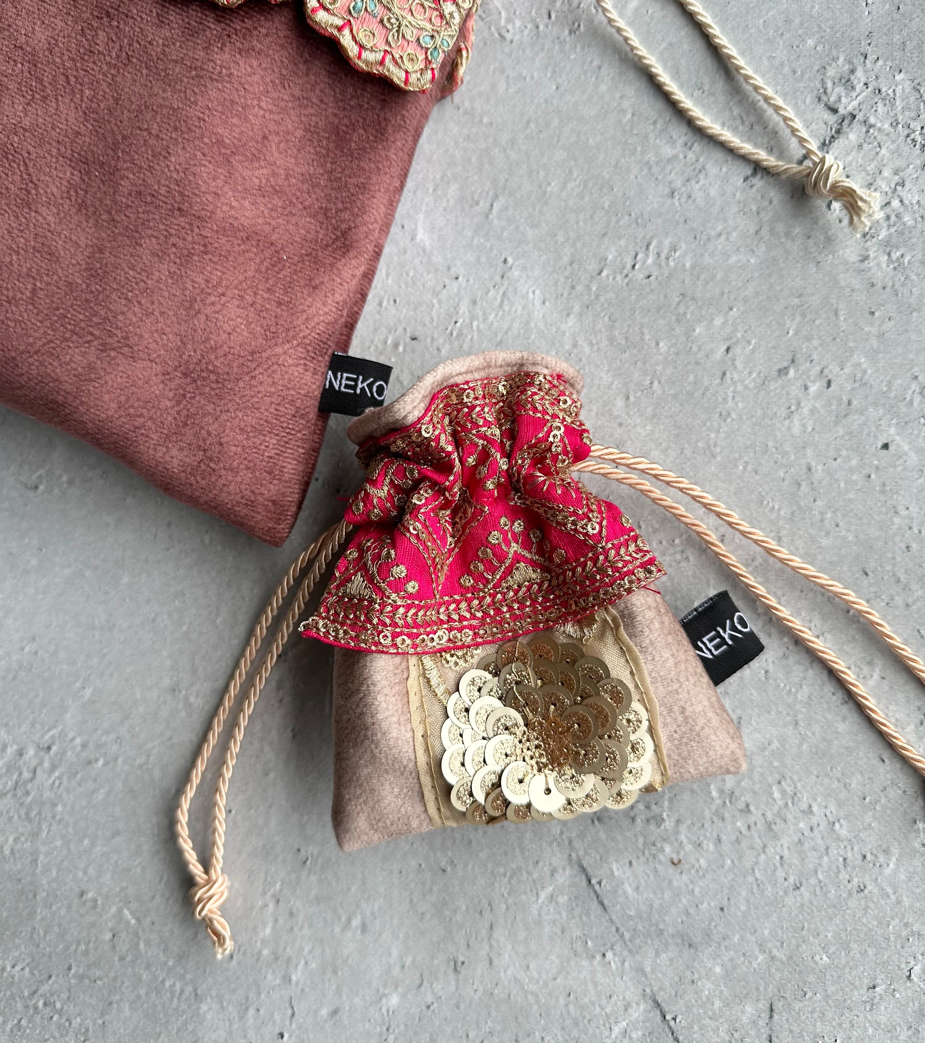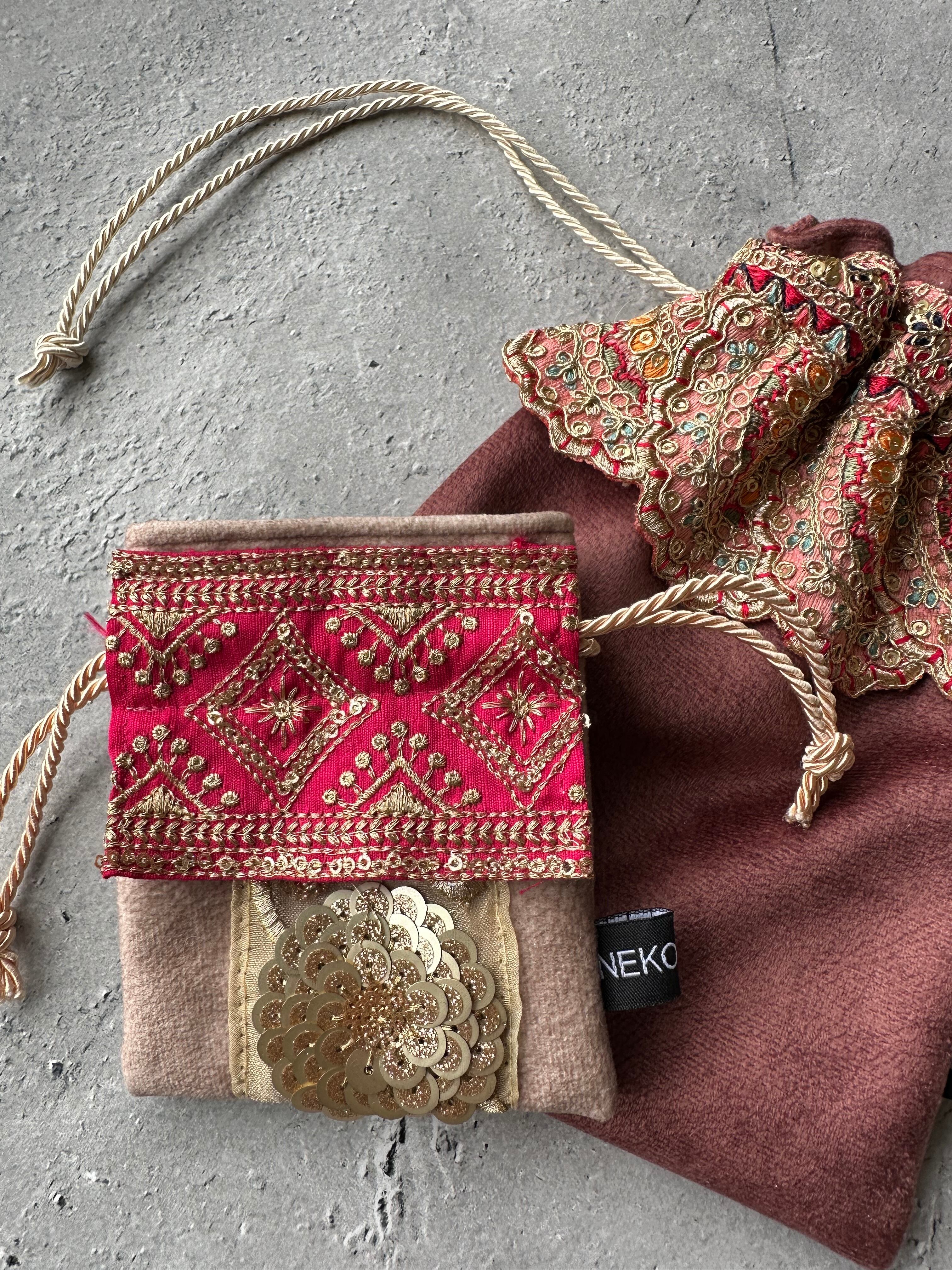 タロットクロス製作で余ったベロア生地と、刺繍リボンなど色々な素材を組み合わせ、遊び心溢れるデコラティブなポーチセットを作りました。