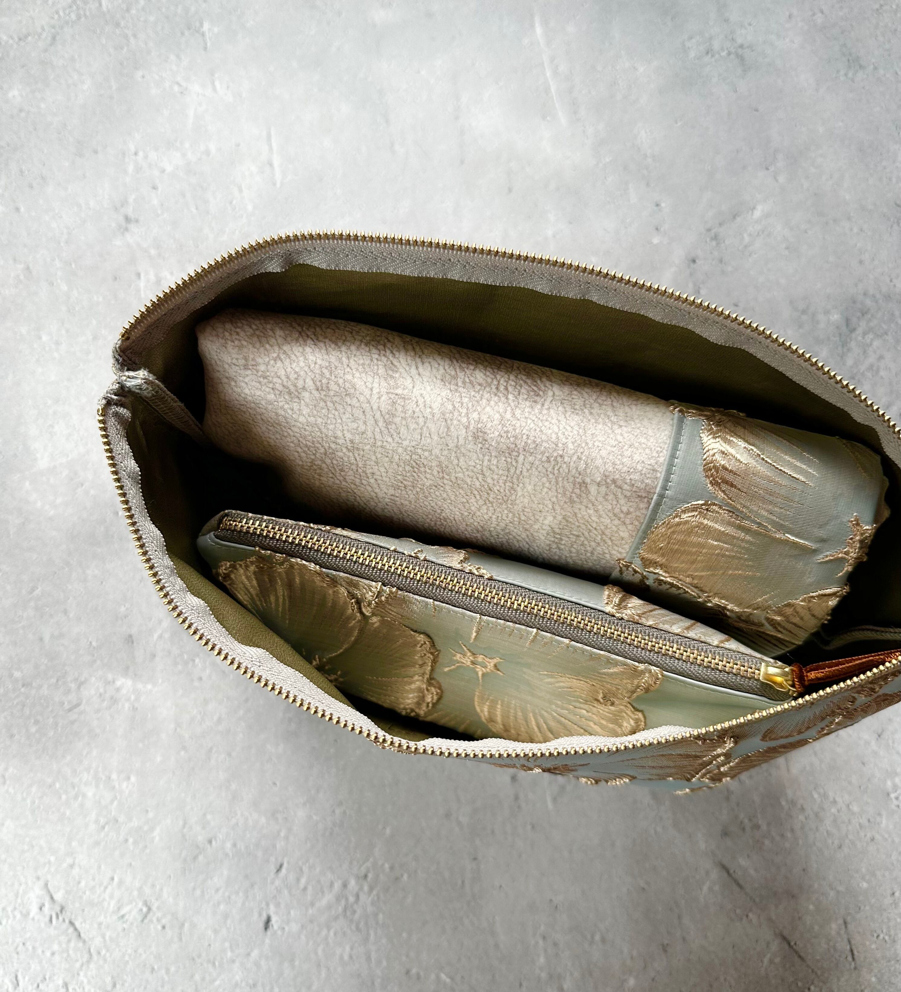 海外製のエンボス立体フラワー生地を使いました。ゴールドの輝きと、ぷっくりとした質感が華やかです。