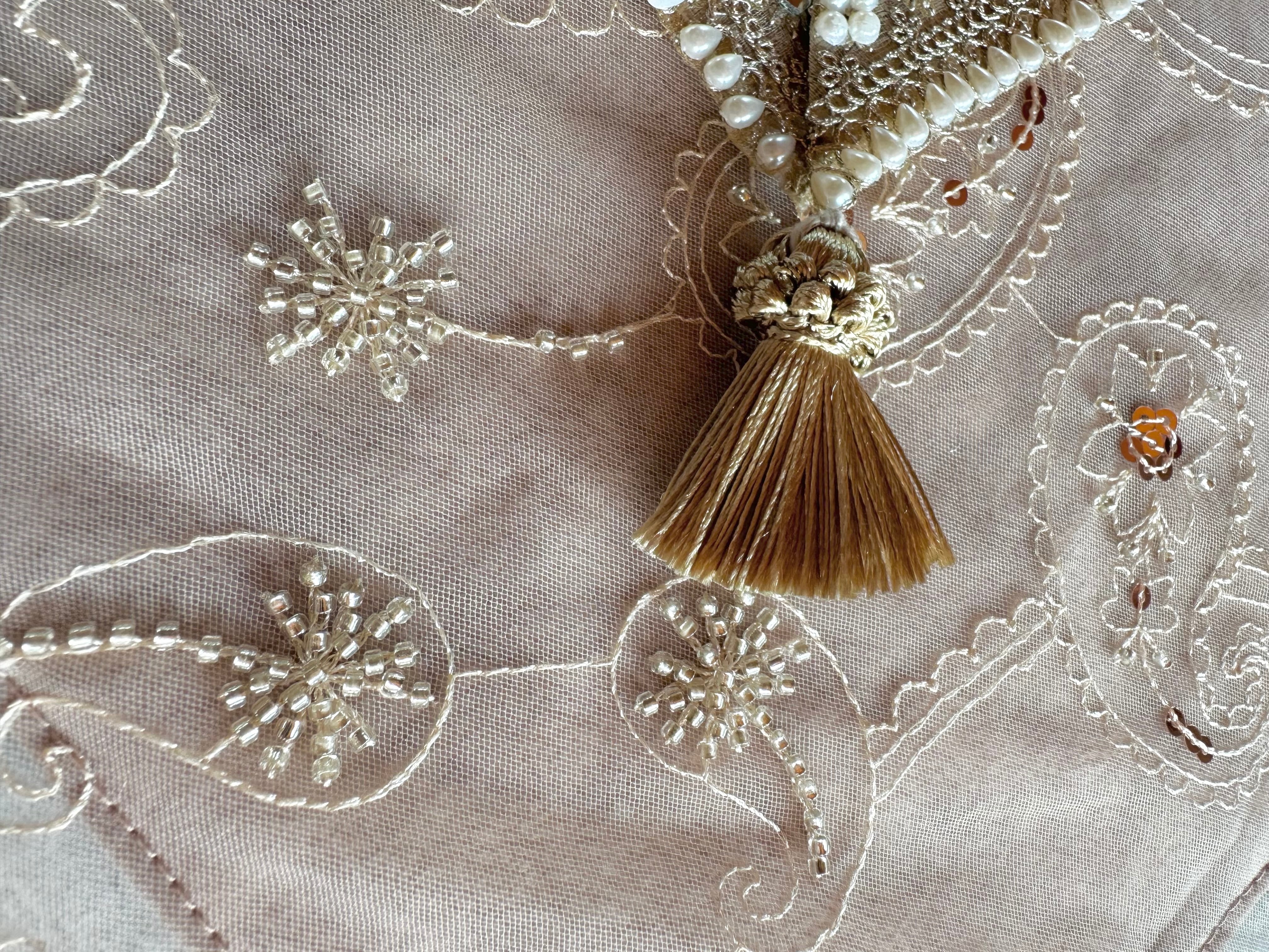 ビーズ刺繍が施された、ペイズリーデザインの高級レースです。ウェディングドレス用の生地です。